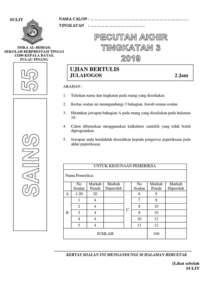 Ujian Kecenderungan Kemasukan MRSM UKKM bagi kemasukan MRSM Tingkatan 1 dan Tingkatan 4. Bank Soalan Percubaan PT3 Sains 2018 adalah antara bahan-bahan terbaik yang kami adaBahan yang terdapat di sini memenuhi keperluan Pentaksiran Berasaskan Sekolah yang dilaksanakan secara menyeluruh mengikut prinsip bahawa semua mata pelajaran yang terkandung dalam KSSM memainkan peranan yang penting bagi memenuhi keperluan jasmani. Jadual Waktu Peperiksaan Pentaksiran Tingkatan 3 2020.