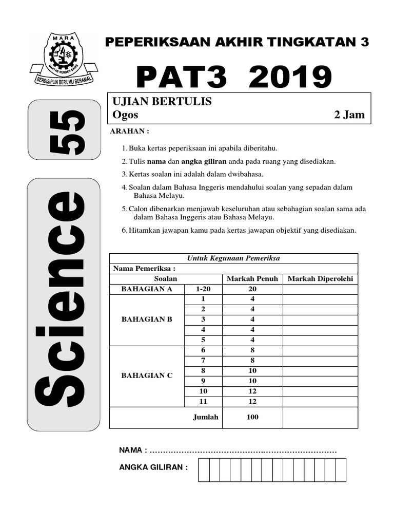 MRSM Maktab Sains Rendah MARA. Koleksi Soalan Percubaan PT3 2020 Skema Jawapan Seluruh Negeri Bank Soalan PT3 Skema Jawapan. Ujian bertulis PT3 2020 telah dibatalkan akibat COVID-19.