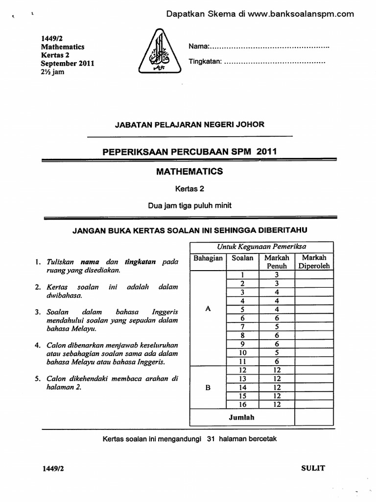 Kertas Soalan Matematik Tahun 2 Pdf. Bank Koleksi Soalan Peperiksaan Percubaan Matematik Mathematics SPM Skema Jawapan.